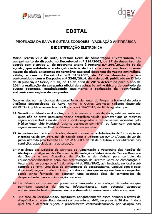 Foi já publicado o edital da campanha de vacinação e identificação eletrónica pelas freguesias.